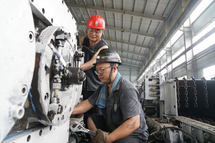 图为丁集矿综机工区职工正在维修运输机减速箱。