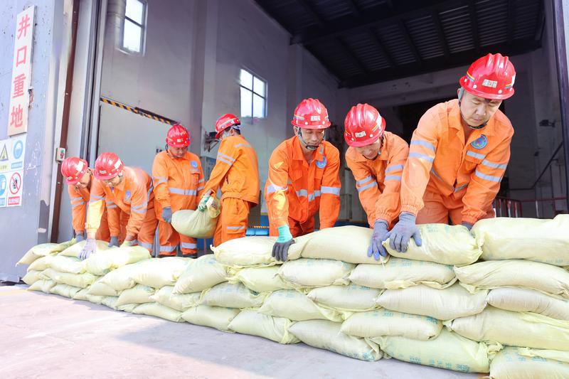 内蒙古地区近期雨水较多,为提升矿井应对雨季灾害的应急处置能力,近日,西部煤电集团色连二矿组织开展雨季“三防”应急演练,模拟应对雨水倒灌等险情,进一步强化职工的应急技能,确保矿井安全度汛。 图为色连二矿职工在副井井口搬运堆放沙袋防止雨水倒灌。 郑雅萍 摄