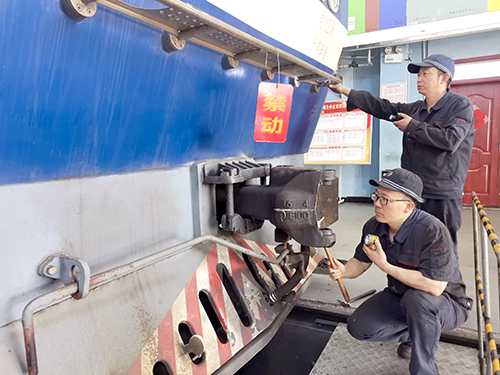 淮河能源股份铁运分公司深入践行“抓安全就是积善行德”,加大隐患排查整治力度,对内燃机车开展全面检修,保障机车安全运行,筑牢矿区铁路运输安全防线。 图为铁运分公司职工在排查车钩安全隐患。 苏健 摄