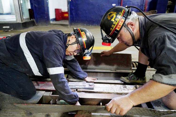 为确保机电运输安全,集团公司全面加强“大机电”管理,明确机电运输监管责任、完善技术管理制度体系,紧盯现场安全管控措施落实,严防关键环节、特殊地段、关键工序漏管失控,全力推动安全生产平稳向好。图为顾桥矿职工正在检修副井单罐进车侧后阻车器。 (李方甜 摄)