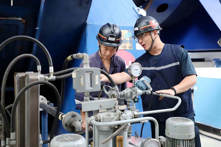 潘二矿持续深化“党员责任区”、“党员示范岗”创建活动,引导广大党员充分发挥“传、帮、带”的先锋模范作用,在安全生产、技术革新、应急抢险等关键任务中亮身份、作表率、当先锋。图为矿保运二区党员骨干(右)向职工讲解主通风机润滑站日常保养要点。(刘辉 摄)
