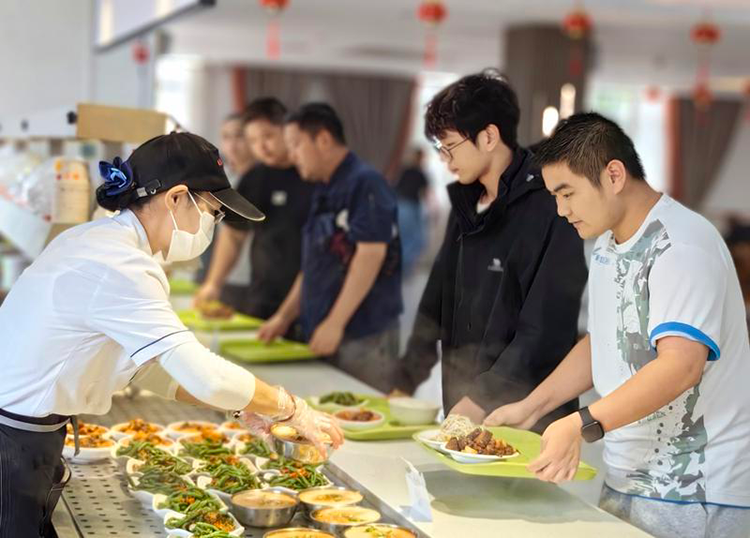 为进一步推进家文化建设,朱集东矿专注职工需求,食堂每日供应荤素均衡、营养多样的佳肴,让职工在忙碌工作后,尽享舌尖温暖,倍感“家”的关怀。图为矿食堂工作人员为就餐职工打饭。(朱凤寅 摄)