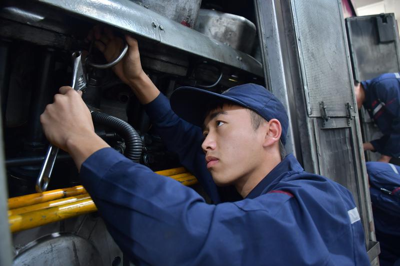 西部铁运分公司认真落实集团公司“六位一体”安全支撑体系建设相关要求,加大机车隐患排查整治力度,确保行车安全。 图为西部铁运分公司检修人员正在按安全生产标准化要求开展检修作业。 魏旋 赵洪洁 摄