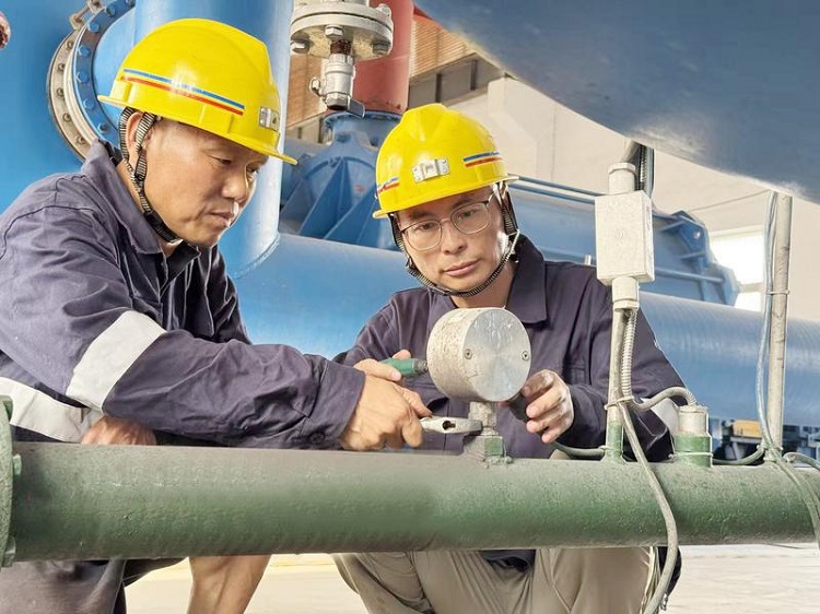 图为顾桥矿抽采一队职工正在检修瓦斯泵无水断电传感器。