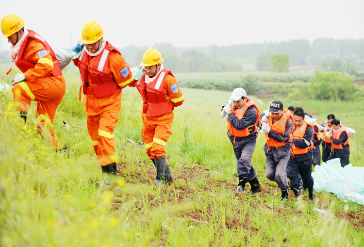 汛期到来,煤业公司张集矿结合防汛应急预案,合理安排,在有关堤坝开展防汛应急演练,模拟可能出现的渗水、管涌、裂缝、脱坡、陷坑等险情并有效处置,进一步提高全员防汛能力。图为该矿防汛演练现场。(吴运生 摄)