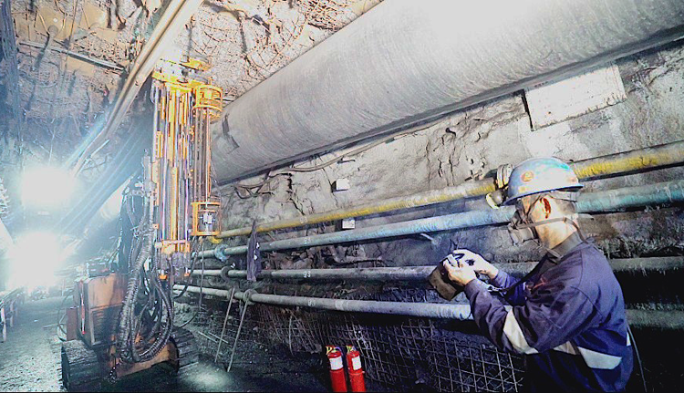 近日,淮沪煤电公司丁集矿引入首台全自动化锚杆钻机,实现了施工锚杆一键到位,极大提高了劳动效率,缩短了劳动时间。图为该矿职工在1242(3)轨顺实操使用全自动化锚杆钻机。(颜畅)