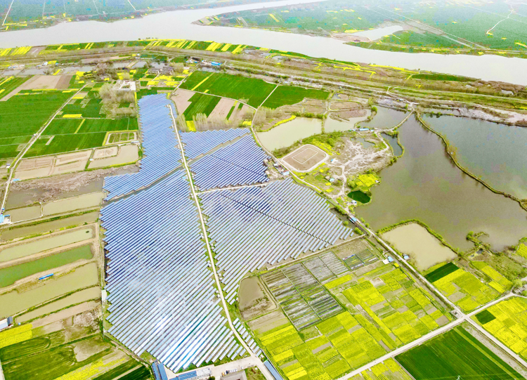 集团公司积极推进光伏项目,提高光伏装机占比,高质量打造淮南高效清洁煤电基地。图为电力集团孔李光伏发电站500米高空下,深蓝色的光伏板铺开陈列,整齐壮观。(刘凌燕)