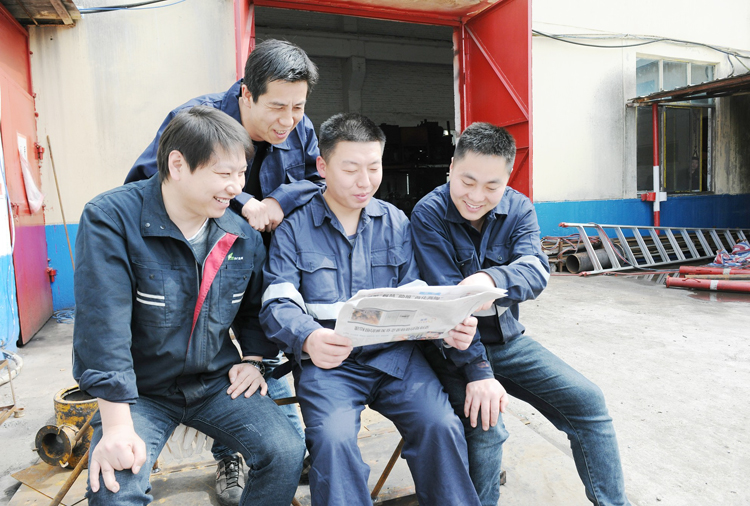 《关于开展集团公司首批首席技师 资深技师评聘工作的通知》下发后,煤业公司潘二矿利用多种渠道向职工宣贯主要内容,确保每一位职工知晓评聘要求和条件,营造人人争当“大拿”的良好氛围。图为该矿抽排一区职工正在利用工间休息时间学习《通知》。(王勇 摄)