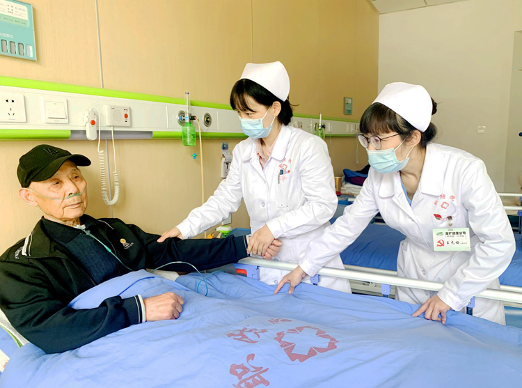 在“5·12”国际护士节到来之际,健康产业集团职防院的护士们坚守岗位,发扬“南丁格尔”精神,细致认真地为病人做好护理服务,守护职工健康。图为职防院的护士们正在病房为病人做护理。(贾智玮)