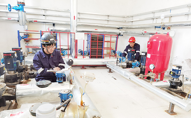 西部煤电集团色连二矿积极建设余热利用工程,通过收集空压机余热为矿井提供稳定热源,每年可节省燃煤3650吨,创造了可观的经济效益。图为该矿保供队职工正在对余热利用设备进行检查(孙飞)