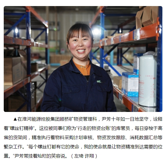 在淮河能源控股集团顾桥矿物资管理科,尹芳十年如一日地坚守,诠释着“螺丝钉精神”。这位被同事们称为“行走的物资台账”的库管员,每日穿梭于高耸的货架间,精准执行着物料采购计划审核、物资发放跟踪、消耗数据汇总等繁杂工作。“每个螺丝钉都有它的使命,我的使命就是让物资精准到达需要的位置。”尹芳常挂着灿烂的笑容说。(左琦 许翔)