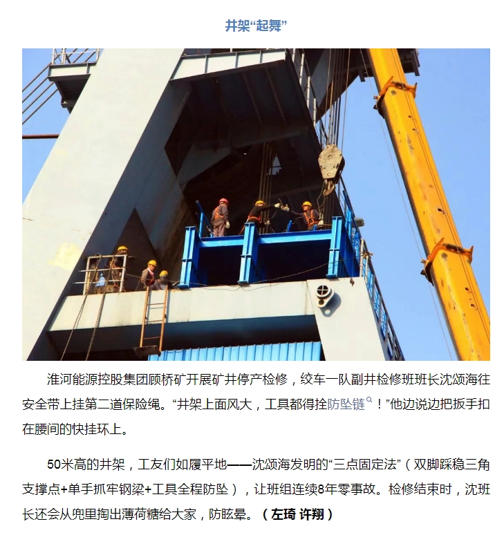 淮河能源控股集团顾桥矿开展矿井停产检修,绞车一队副井检修班班长沈颂海往安全带上挂第二道保险绳。“井架上面风大,工具都得拴防坠链!”他边说边把扳手扣在腰间的快挂环上。