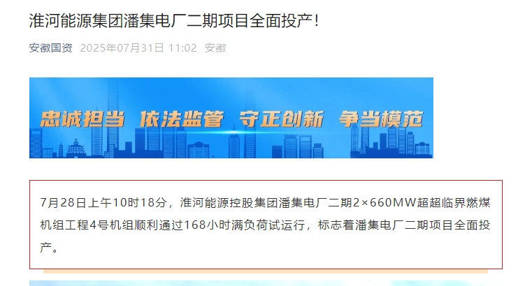 7月28日上午10时18分,淮河能源控股集团潘集电厂二期2×660MW超超临界燃煤机组工程4号机组顺利通过168小时满负荷试运行,标志着潘集电厂二期项目全面投产。