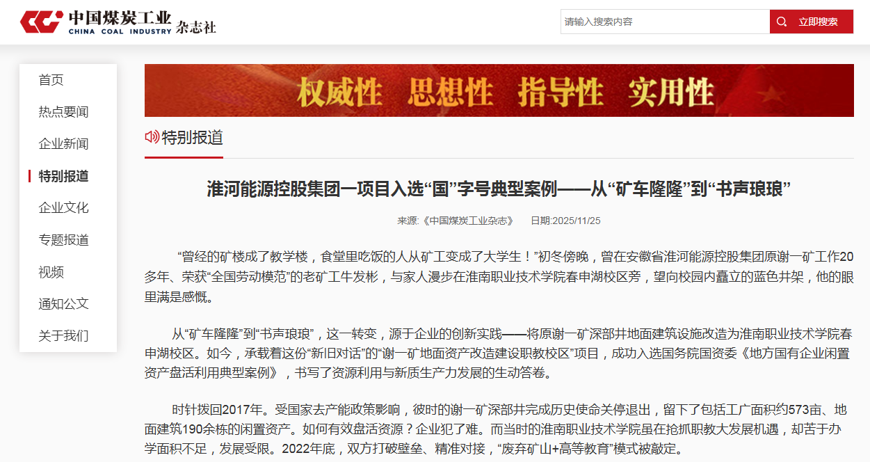 中国煤炭工业杂志丨淮河能源控股集团一项目入选“国”字号典型案例——从“矿车隆隆”到“书声琅琅”
