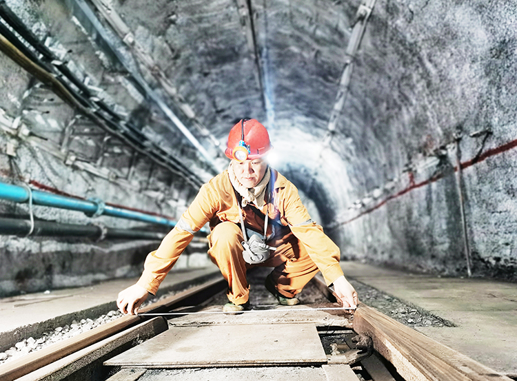 图为该矿安全监察科职工正在测量井下运输大巷轨道间距。(陈恩文 摄)