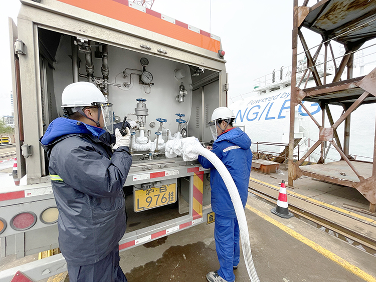 图为LNG加注操作组人员正在与船方服务商沟通并调整通液氮进气速率。 (赵正夫 摄)