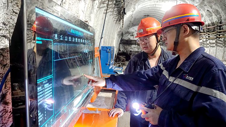 图为该矿技术人员正在检查单轨吊集控系统运行情况。