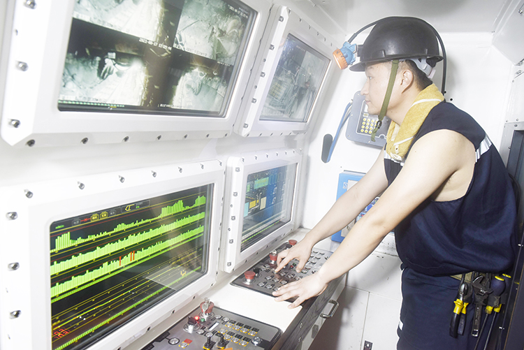 ▲ 基层矿井职工在井下智能化工作面操作台控制设备运行。