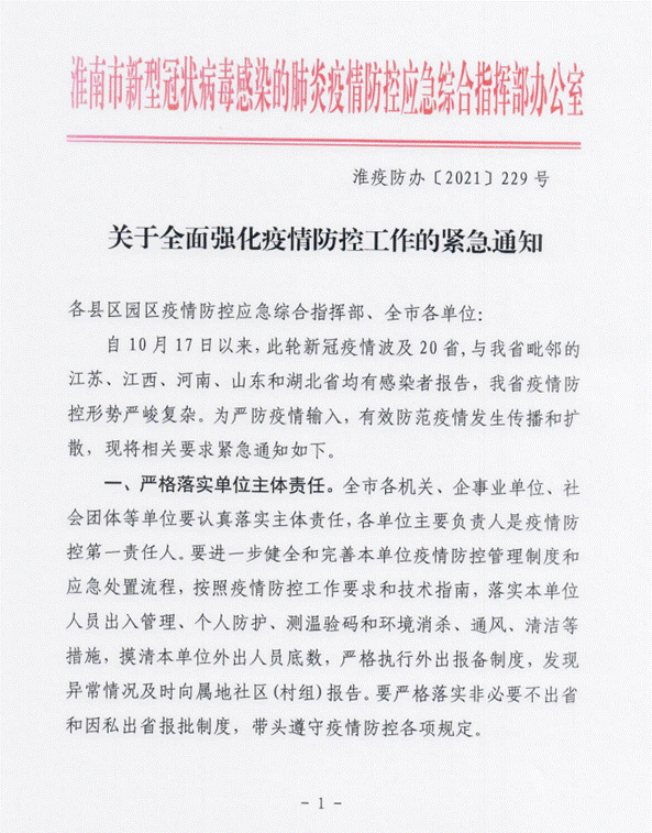 现将淮南市新冠肺炎疫情防控应急综合指挥部办公室《关于全面强化疫情防控工作的紧急通知》(淮疫防办〔2021〕229号)转发给你们,请高度重视,认真抓好宣传和落实。