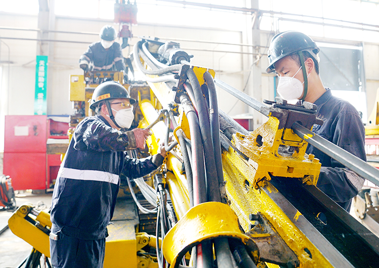 图为该矿综机工区职工在检修液压钻车。( 颜畅 胡青松 摄)